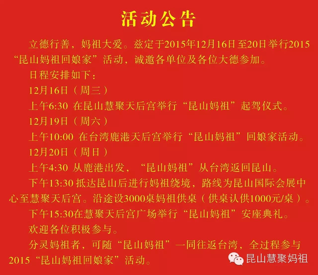 立德行善,妈祖大爱。兹定2015年12月16日至20日举行2015“昆山妈祖回娘家”活动,届时将按照妈祖传统礼俗一起热闹,我们诚挚地邀请您一同出席本次两岸文化盛事,共襄盛举。